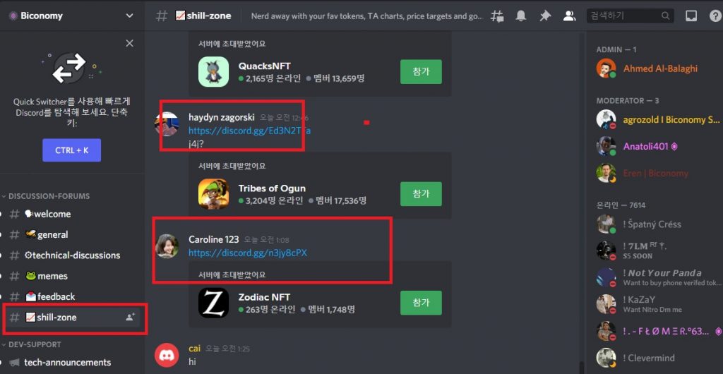 4. 쉴링 방 찾아서 j4j? 하고 물어본 후 입장을 맞교환하기. 어려운 영어 필요 없음. 본인이 초대 이벤트 할 디스코드 초대 링크 올리고 j4j(join for join)? 하면 됨. 쉴링 방이 없는 서버도 있으므로, 쉴링 방이 없다면 다른 디스코드 서버를 찾아 거기서부터 본인이 목표로 하는 프로젝트의 초대를 채우는 것도 좋은 방법.