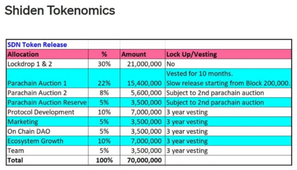 아스타의 쿠사마버전은 SDN 샤이덴이다. 원래 이름은 플라즘이었는데 아스타로 리브랜딩 하였다. 덕분에 아스타라는 김치코인이 있는 한국 내 인식은 오히려 하락했다… 아스타는 써큘레이팅 서플라이(공급량) 그래프도 찾을 수 없었는데, 때문에 샤이덴의 초기공급량을 참고했다. 샤이덴에서 베스팅 일정이 없는 것은 락드랍 30%이다. 이를 참고해 아스타 역시 락드랍 30%에 파라체인 옥션 초기 공급 10%를 계산하면 40%의 초기공급량이 예상 되며, 초기 1달의 공급량은 약 41.8%이다(1년 인플레이션율 10%, 3년 베스팅 일정의 1달 분량 고려).