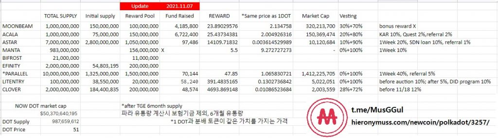 *표를 잘못 해석하시는 분들을 위해… 마켓 캡이 작다는 뜻은 지금 가격으로 산정된 가치가 작다는 뜻. 마켓캡이 시작부터 큰 상태에서 더 이익을 챙기려면, 더더더 커져야 하는 거니까 부담이 된다. 크다, 작다의 기준은 가장 잘 되고 있는 MOVR의 현재 시가총액이 $866,201,170. 대신 이번 폴카닷 파라체인은 ‘메인 프로젝트들이니까+바낸 갈끄니까’ 어느정도 가감해서 고려하시길.