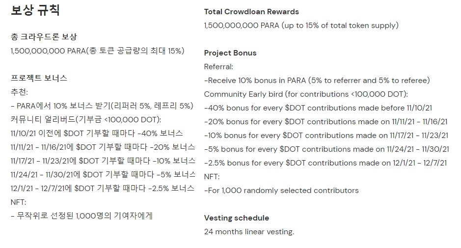 한 마디로 말하겠다. 굳이 언급안하는 프로젝트는 다 이유가 있어서 안하는 것인데, 반대로 페러렐은 언급 해야할 정도로 정신을 못차렸다. 보상은 1DOT당 33PARA로 고정인데 심지어 락업해제 전혀 없이 24개월 베스팅이다. TGE후 6개월 유통 공급량 중 유동성 채굴(5.75%)을 제외하고 크라우드 론의 보상이 3.75%로 가장 높기는 하다(이를 계산 할 때에는 보험기금 5%는 고려하지 않았다). 유동성 채굴이 큰 것을 보면 나중에 유동성 채굴을 해보는 것도 나쁘지 않겠다. 그러나 고정비율, 심지어 좋지도 않은 보상량에 DOT을 박는 것은 목차 2번에서 첨부한 표를 참고하고 그 이상의 가치가 생길 것이라 생각하는 분만 하시길. 프로젝트에 대한 자세한 설명은 과거 작성한 헤이코 설명을 보는 것이 낫다(헤이코는 이렇지 않았음, PARA도 나중에 정신 차릴듯).