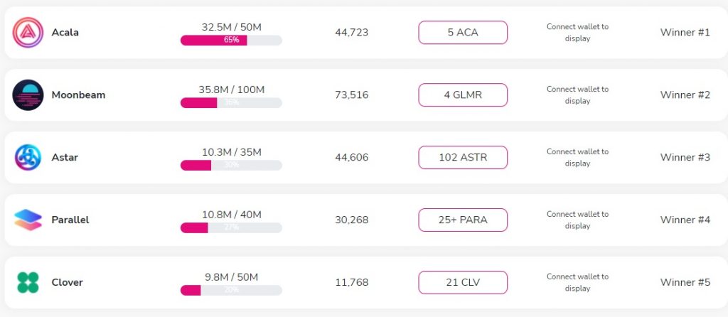 파라체인 옥션에 대한 대중들의 관심을 집중시킨 바로 그 프로젝트. MOONBEAM(이름에서 이미 잘 될 것 같더라). 문빔의 쿠사마버전 문리버 때는 굉장한 수익을 가져다 주었는데, 그 이유는 큰 배정량(총 물량의 30%)과 좋은 손익비에 있었다. 쉽게 말해 퍼주는 양도 많은데, 그 많은 양을 적은 수가 나눠먹으니 손익분기점도 매우 낮았다.